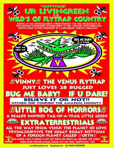 It was said long ago that a raging white flamed meteroite streaked past Venus like a shooting star, falling from outer space, crashing upon our planet URTH (EARTH) forming Soggy Boggy Bottoms of the Deep Blue CarolinaBays, leaving behind in its' tail-of-a-trail Our own "VINNY" THE THE MEAT-EATING VENUS FLYTRAP FAMILY AND FRIENDS IN THE WILD'S OF "FLYTRAPCOUNTRY "